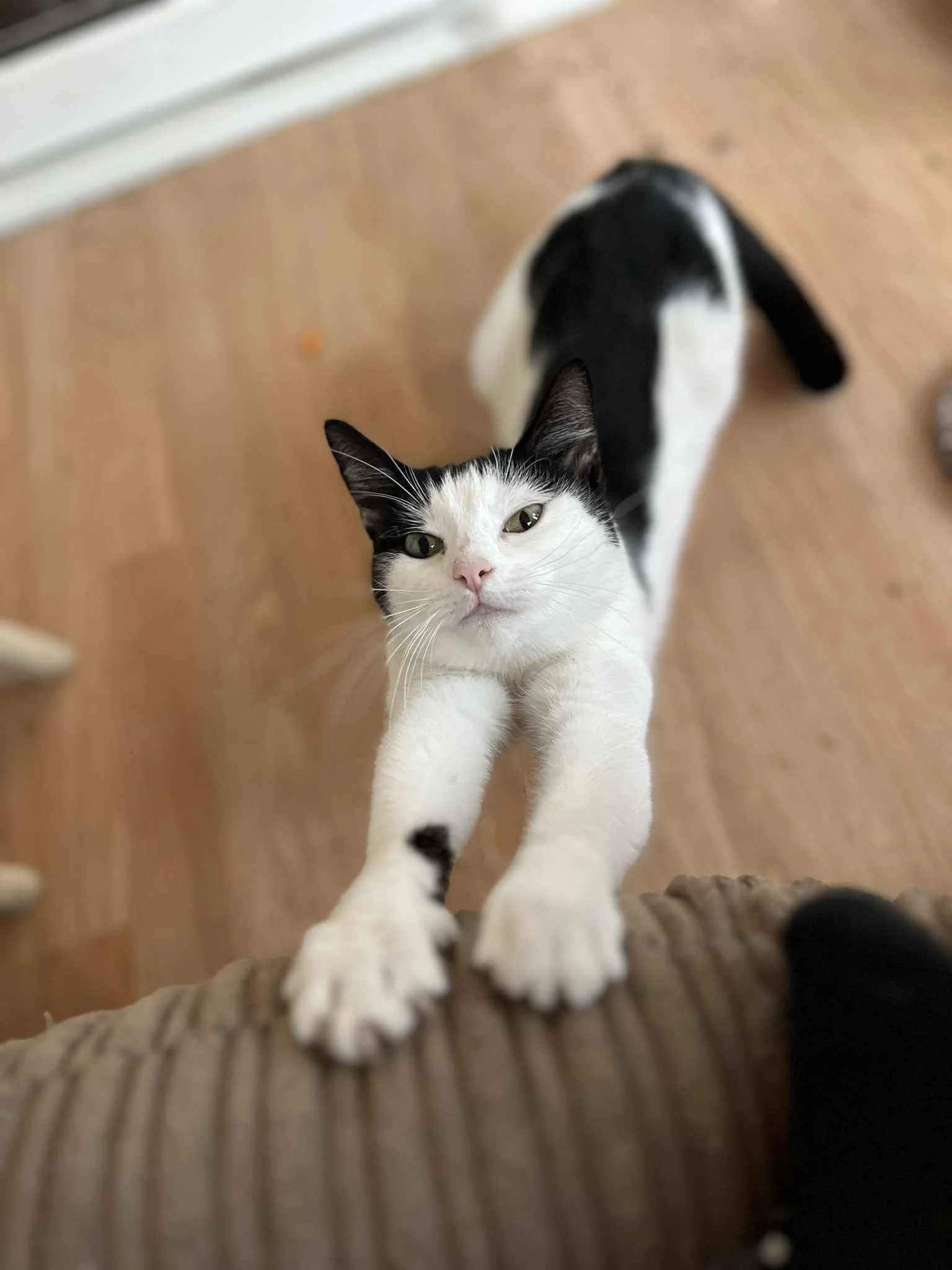 At the moment, the two of them average out at the normal amount of feline affection. With the right, patient home they could be exceptional! Fluffbert & Gus are looking for a home that wants to help them, with love, patience and space to play. They may not be the ideal cats for a home with young kids, because of Fluffbert’s fears, but they have a lot to give, and are really hoping for some sofa time, strokes, meals and affection