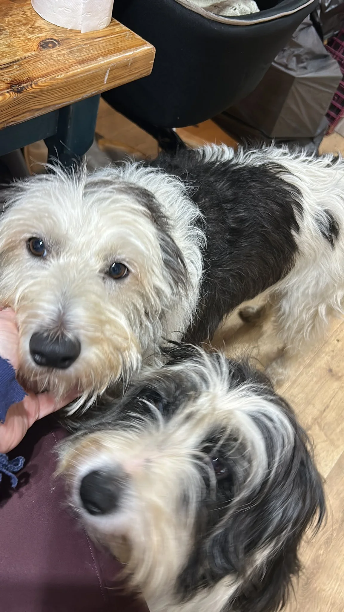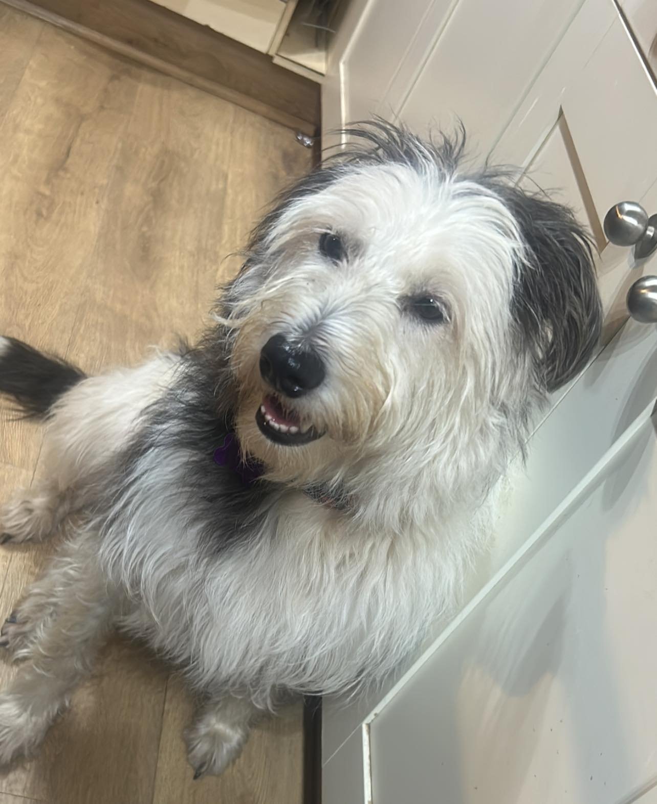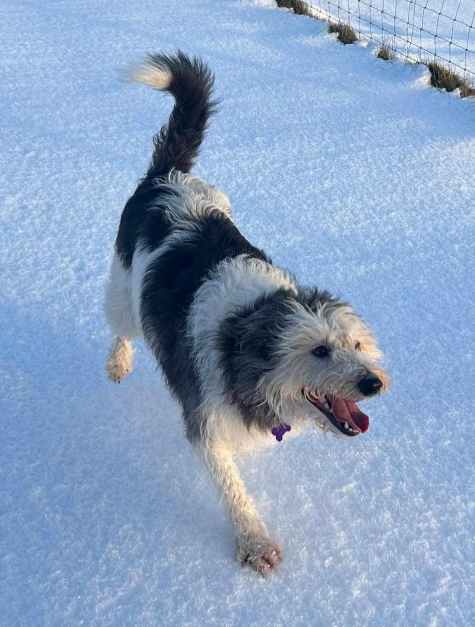 She’s a 4‑year‑old girl described as a lurcher, though she looks and behaves very much like a bearded collie. She is around 25kgs. What matters most is her nature: calm, gentle, loving, and deeply devoted.