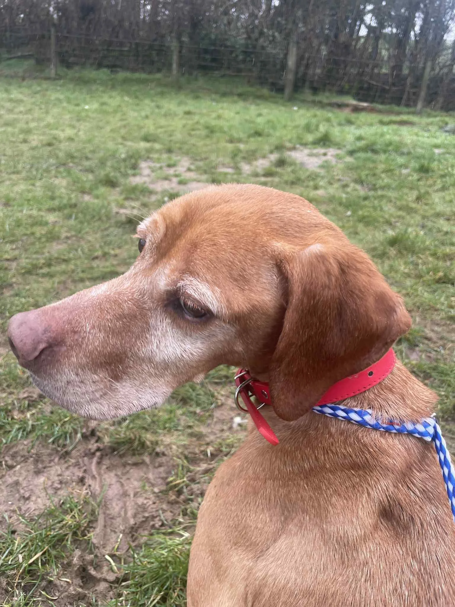 She is around six years old, 12kg, beagle‑height, and almost certainly a podenco mix — not a vizsla, despite the number of confident guesses.